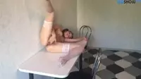 Girl Masturbates All Fours Table Spreads Pussy, Stimulates Clit and Cunt for Doggy Style Orgasm